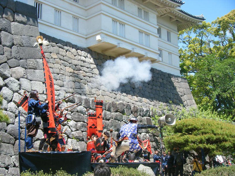 私たちは昨年登ってるので天守には登らず、広場で鉄砲隊のパフォーマンスを見ます。